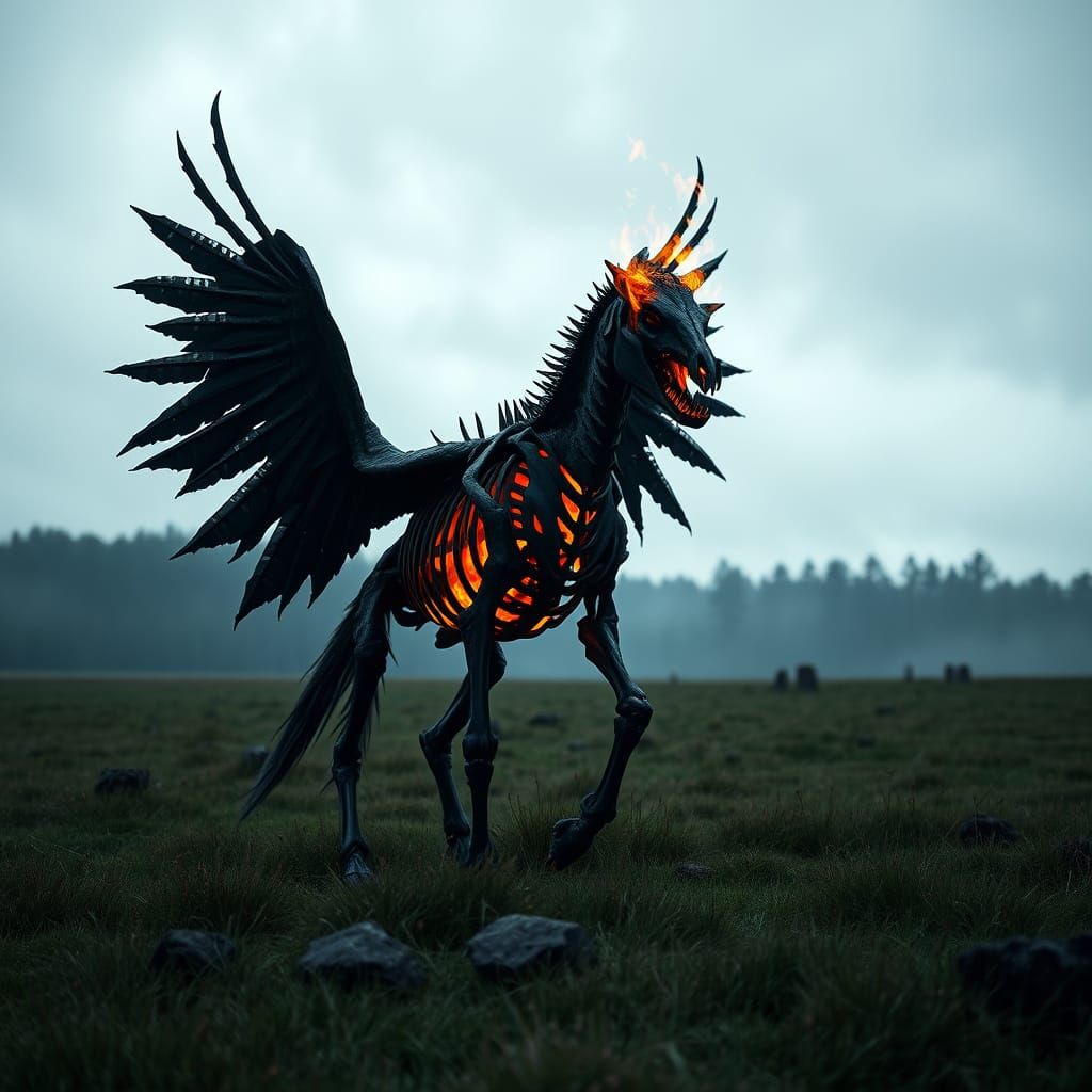 This image shows a skeletal black pegasus in a shadowy meadow. The creature's bones glow with embers and its wings are partially aflame, creating an eerie scene with cinematic lighting.