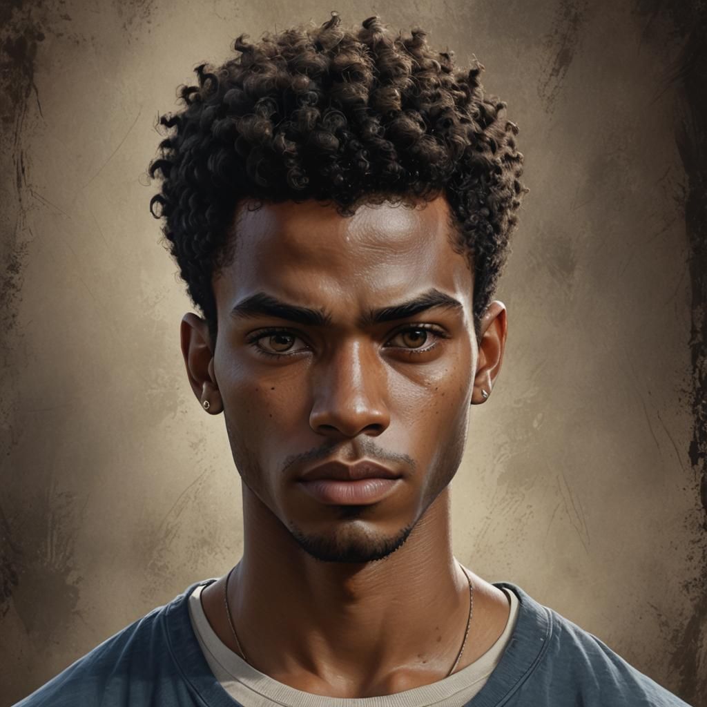 A striking picture of a muscular, handsome Afro-Latino man with short black hair. This detailed digital painting captures a serious yet friendly expression with a fantasy concept art aesthetic.