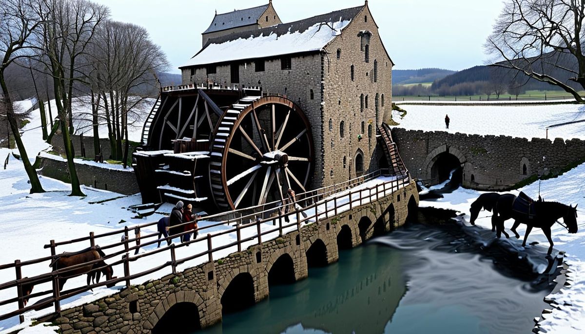 This image shows a medieval waterwheel in motion, powering an aqueduct to a castle on a cold spring day with melting snow. People and horses are walking in the surrounding landscape.