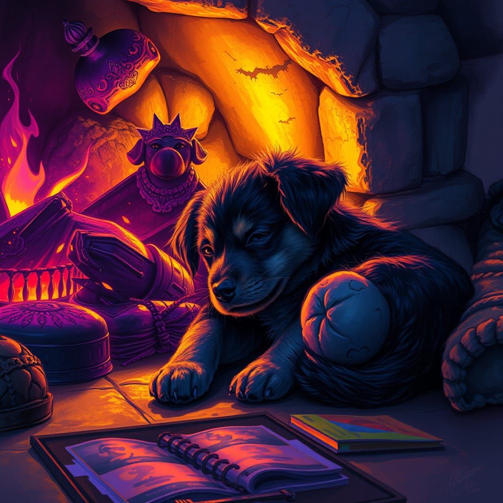 This image shows a puppy asleep near a fireplace, rendered in a detailed alcohol ink style with dramatic lighting and deep colors, resembling concept art.