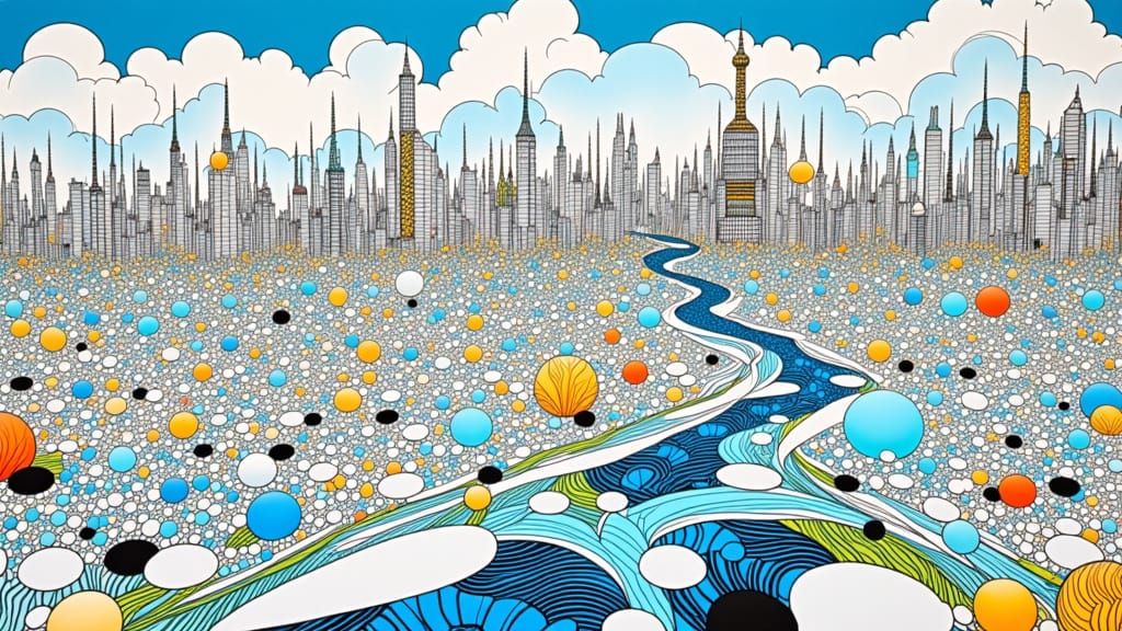This avant-garde digital painting depicts the flow of time with a luminous sky, dense forest, and cityscape. A central circuit board merges with an orrery, while a winding river flows through the scene. The artwork uses vibrant blues, greens, and silvers.