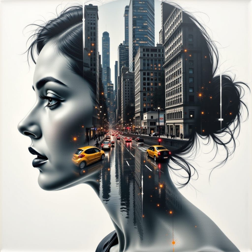 <lora:ComplexionV2:1.0> <lora:DreamLike V2:1.0> Spiriling Double Exposure Portrait skyscrappeq Digital watercolor Illustration with Dual Exposure of cityscape cars inside the portarait, by JK Waterhouse, Carne Griffiths, Minjae Lee, Ana Paula Hoppe, Stylized watercolor art, Intricate, Complex contrast, ...