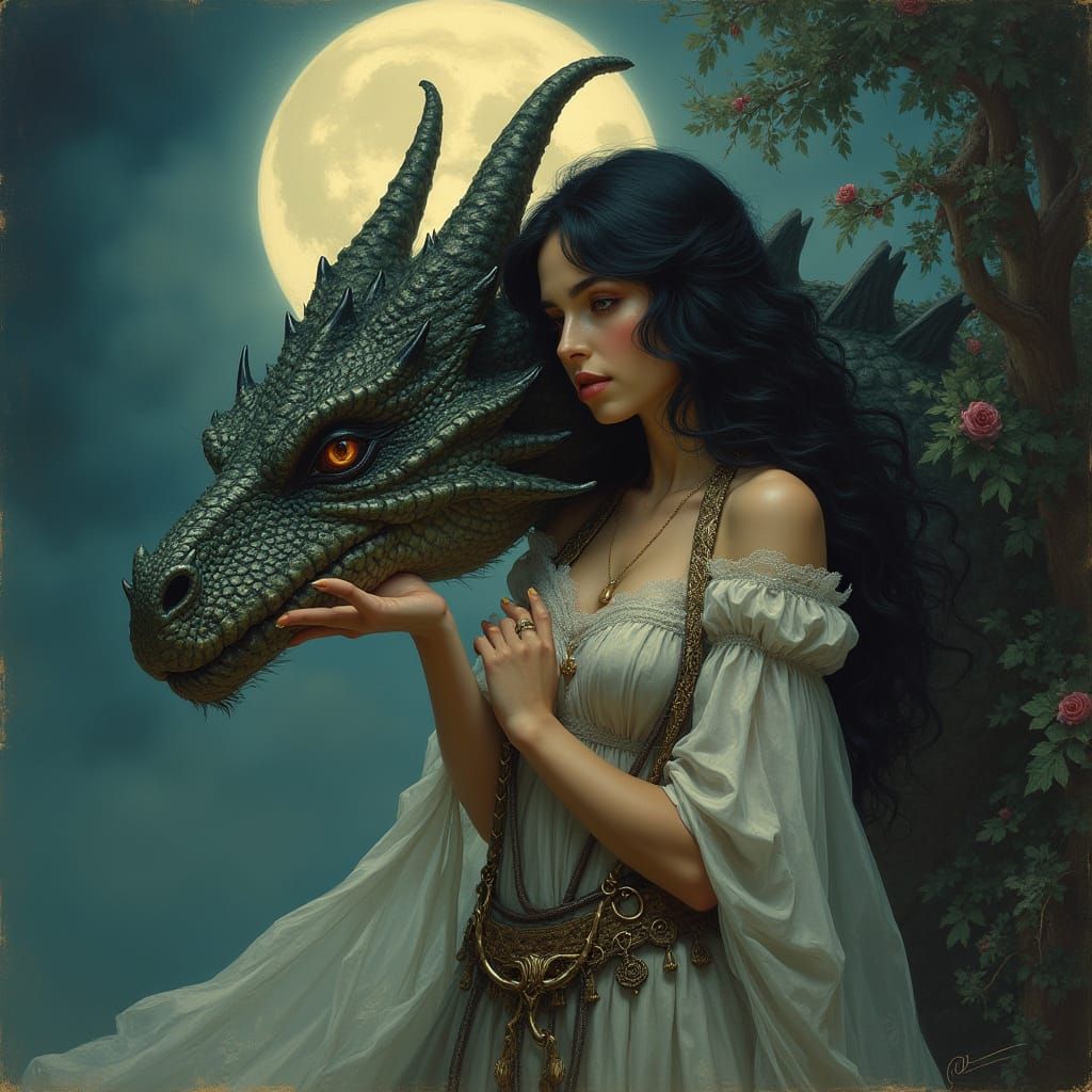 A captivating image of a dark-haired woman in medieval dress with a dragon. The dragon rests its head in her hands in this fantastical scene, reminiscent of classic fantasy art.
