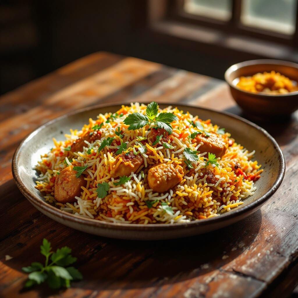 This image showcases a delicious plate of biryani with fresh herbs on a rustic wooden table. Captured with cinematic lighting and a shallow depth of field, it highlights the dish's appetizing details in photorealistic 8k resolution.