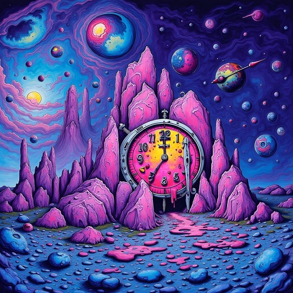 This image shows a spaceship landing on a surreal moon. Jagged rocks and swirling clouds are rendered in vivid, electric colors. The scene evokes a dreamlike, hallucinatory style.