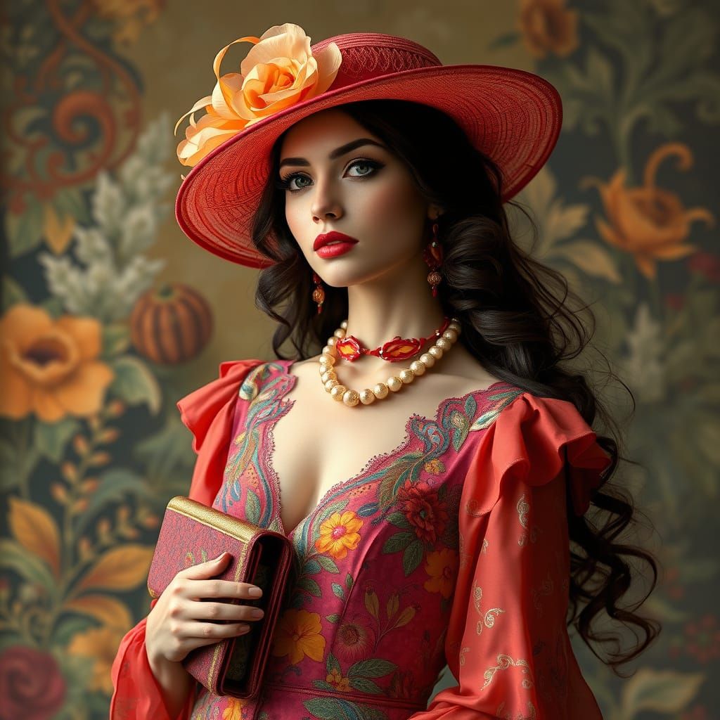 A digital painting of a woman in colorful elegant attire, complete with a matching hat, purse, and shoes. The image evokes an Art Nouveau aesthetic with a bohemian chic style.