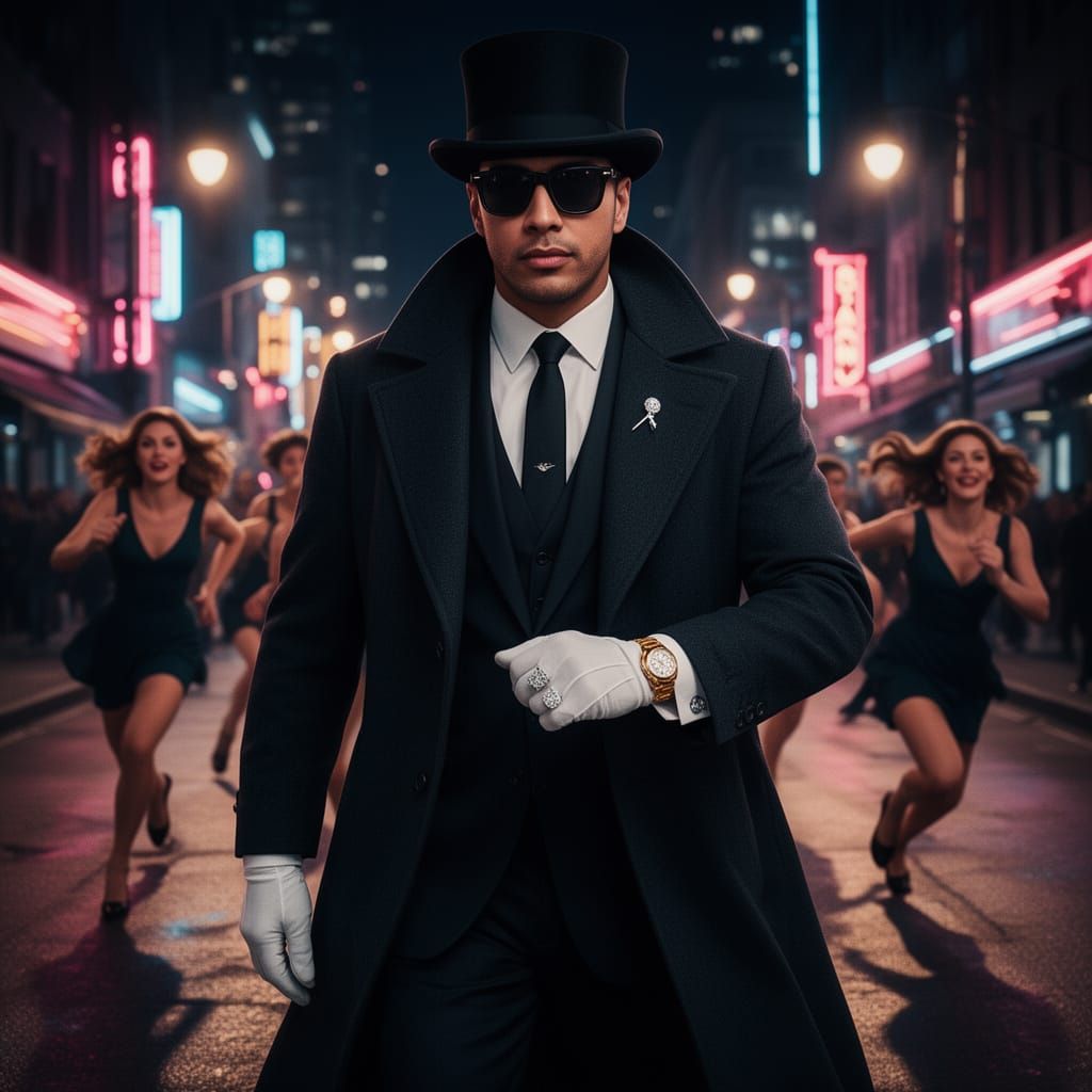 This image shows a confident man in a detailed suit and accessories on a vibrant, neon-lit city street at night. Photorealistic with cinematic lighting, creating a mysterious and alluring atmosphere.