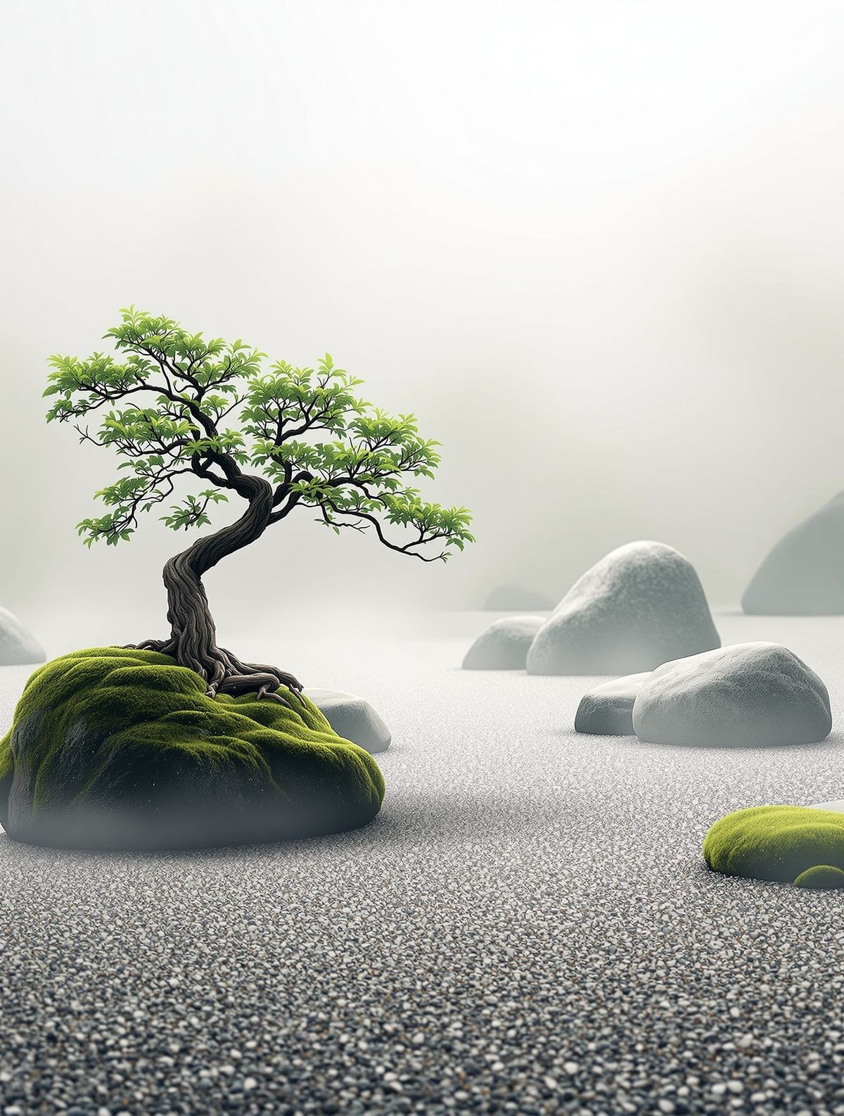 A tranquil zen garden scene featuring raked gravel, mossy stones, and a bonsai. The soft colors and minimalist rendering create a peaceful atmosphere, reminiscent of traditional Japanese art.