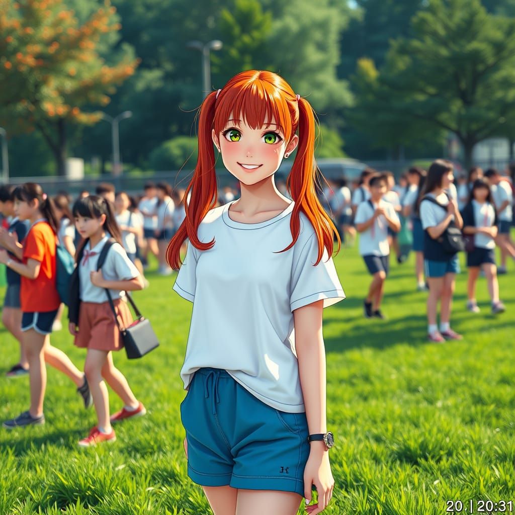 (hyper realistic) pretty and petite Japanese female with long red pigtails hair and green eyes. Smiling warmly at the viewer. Outdoors Japanese School Sports Field, School festival, Sports Day. Students dressed in white T-shirts and blue shorts. Track and field day. Showa Women's University Central Ground ...