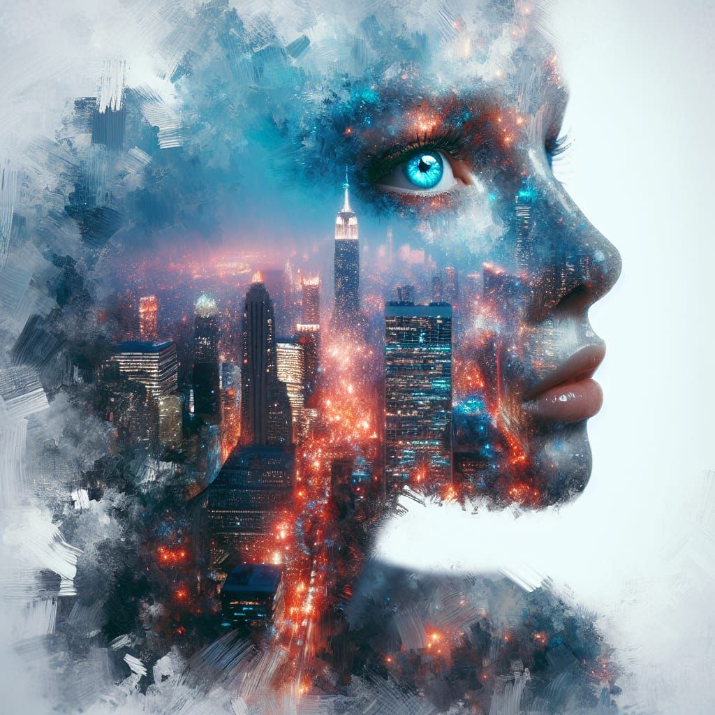 This image captures a surreal blend of a woman's silhouette and a neon-lit cityscape, evoking the textured brushstrokes of pre-1912 impasto paintings.