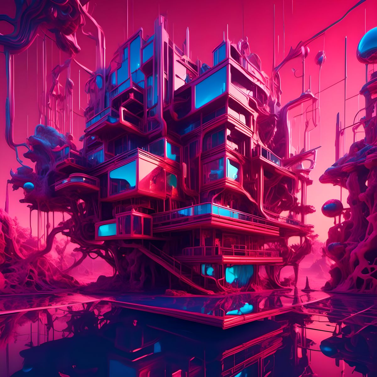 This image shows a futuristic abstract building with glitching and hacking effects. The digital art features polycarbonate plating and a dynamic cyberpunk aesthetic with veridian and crimson colors.
