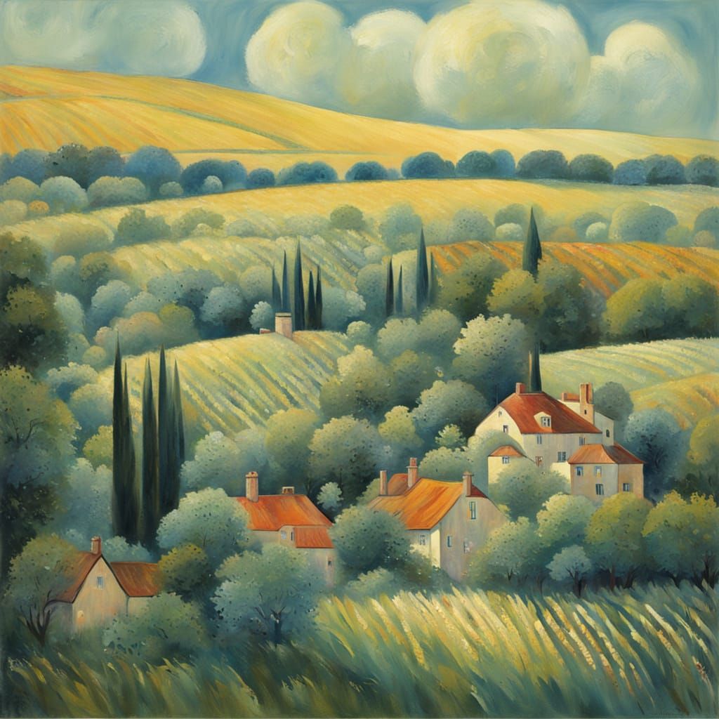 This image captures a serene landscape with soft brushstrokes and vivid colors reminiscent of Impressionist masters, blending the styles of two artists.