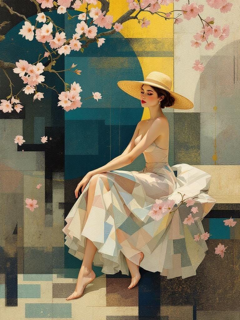 This image features a retro-style pin-up figure blended with Mondrian-esque geometric abstraction, set against a soft garden backdrop. The artwork employs a pastel technique and volumetric rendering to create a warm, approachable aesthetic.