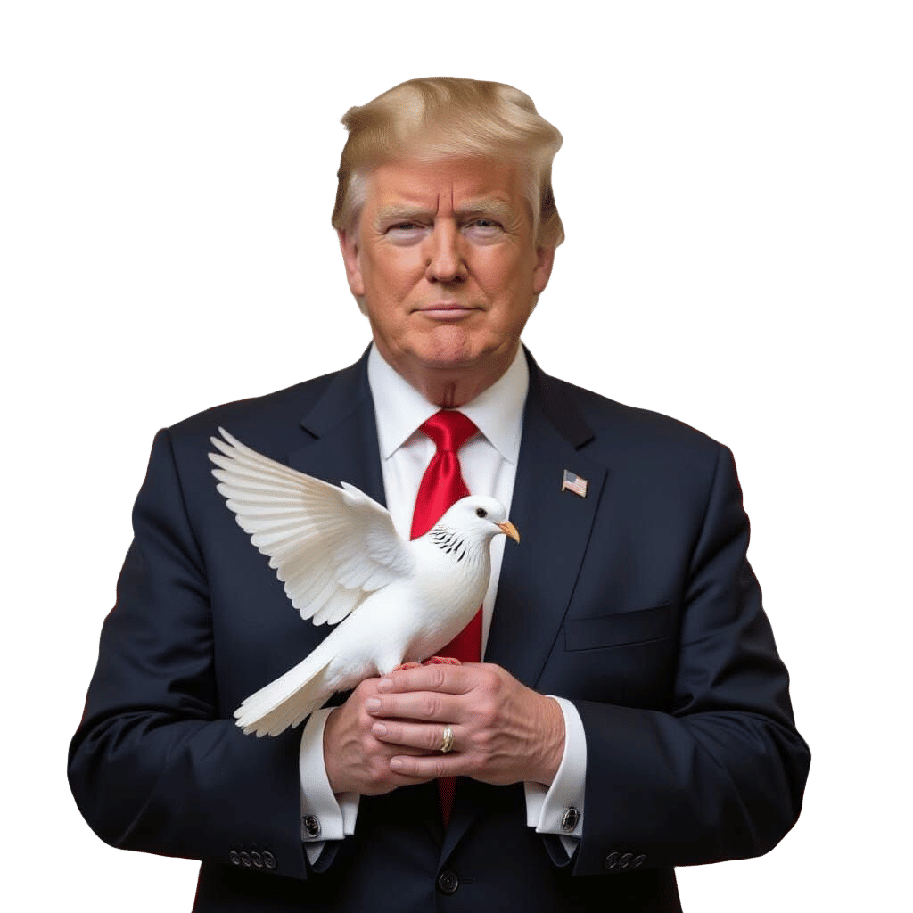 A portrait of Donald Trump in a suit holding a dove. The image features dramatic lighting and patriotic symbolism in a classic realism style.
