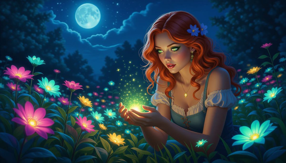 A striking image of a woman with vibrant red hair and green eyes in a garden filled with glowing flowers. The scene features magical atmospheric lighting and vivid colors, rendered as digital matte painting with cinematic realism.