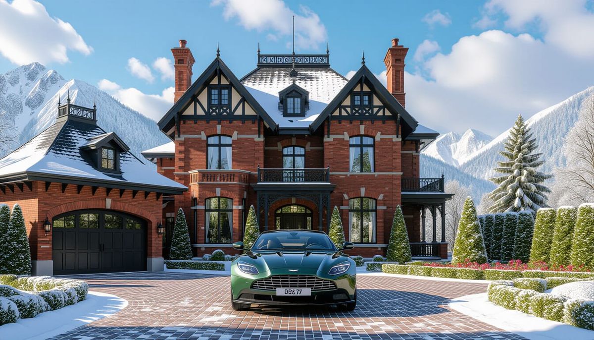 A painterly image of a grand Victorian chateau with a dark green Aston Martin. Features evergreen trees, snow, a flower garden, and mountains under a blue sky, in a textured, elegant realism style.