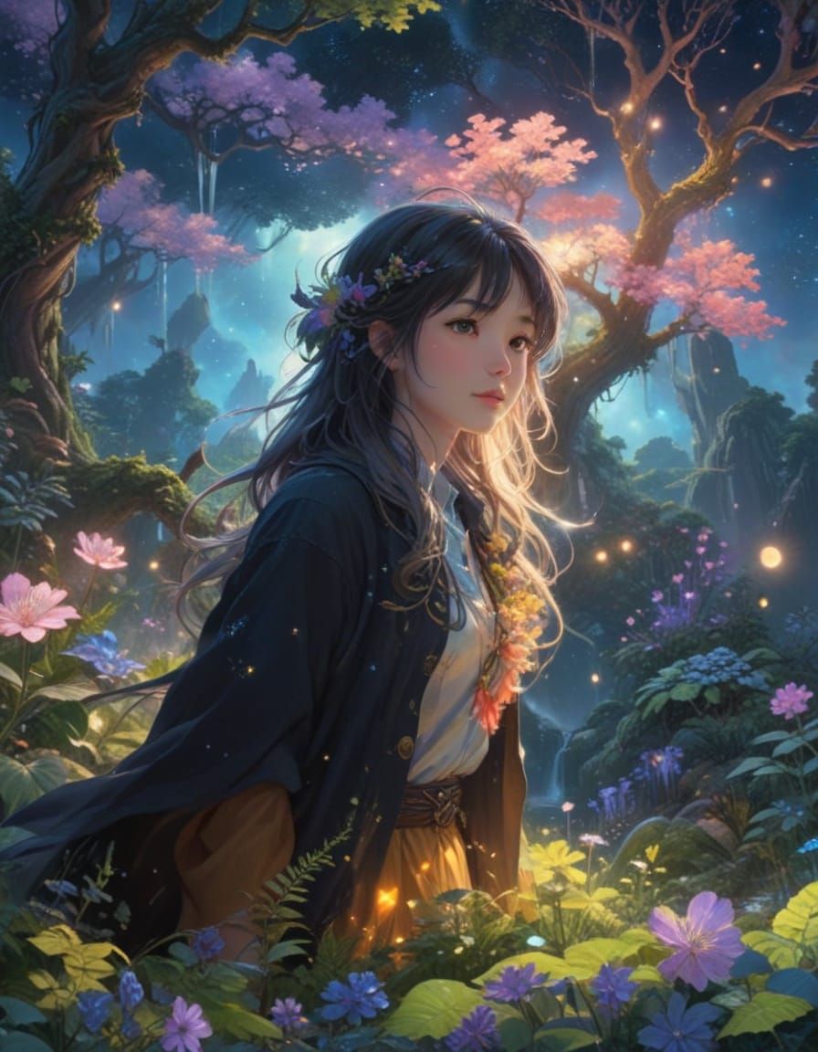 This enchanting watercolor painting transports viewers to a mystical garden, teeming with magical bioluminescent flowers, ancient trees, and peaceful creatures. Inspired by anime art and dreamy landscapes, the artwork features a rich color palette and a sense of wonder.