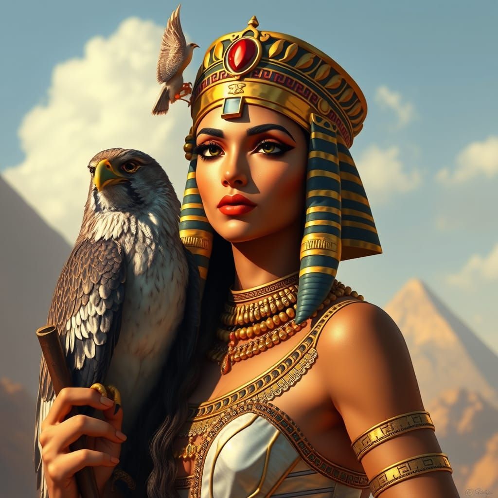 This image shows a powerful high priestess and the majestic falcon god Horus in a realistic ancient Egyptian setting, blending myth and mysticism.