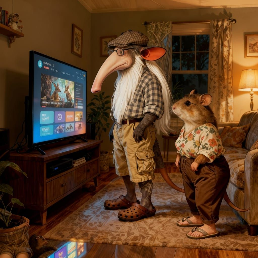 This image depicts an anthropomorphic aardvark and hamster relaxing together watching a smart TV. The aardvark is dressed casually, while the hamster wears indoor attire.