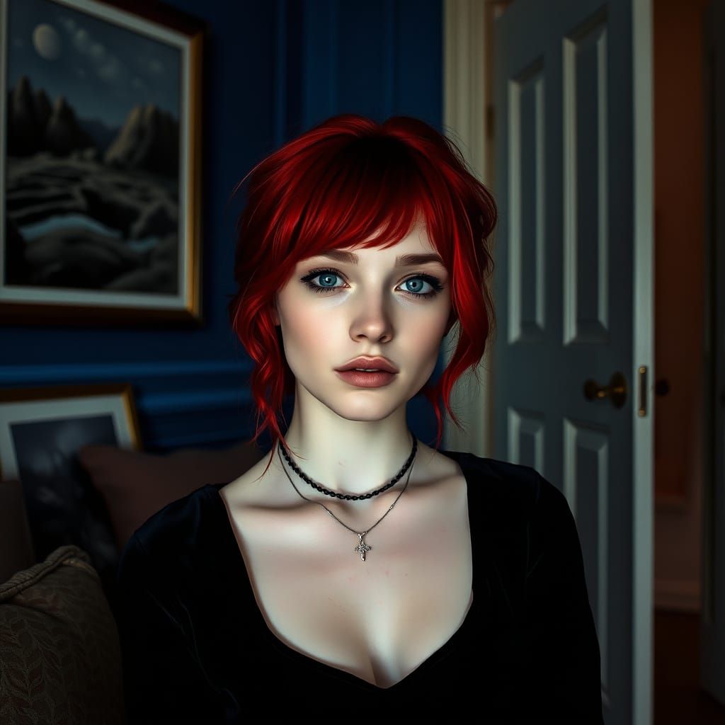 A captivating image of a woman with striking red hair in a dimly lit, surreal setting. The artwork features a blend of realism and fantasy, with soft shadows and rich textures.