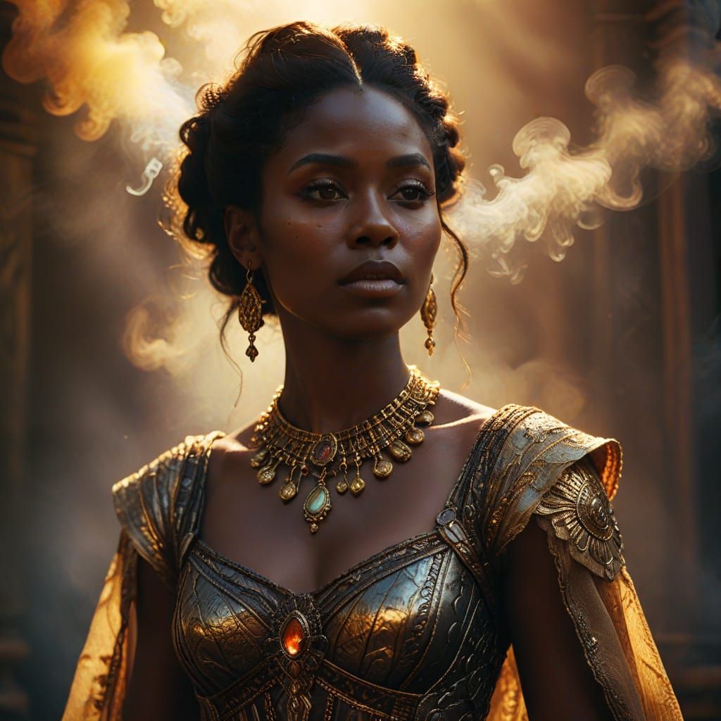 A striking picture of a dark-skinned woman in ornate clothing. Golden light illuminates her through a smoky haze. The photorealistic image features rich textures and vibrant colors, reminiscent of Romanticism.