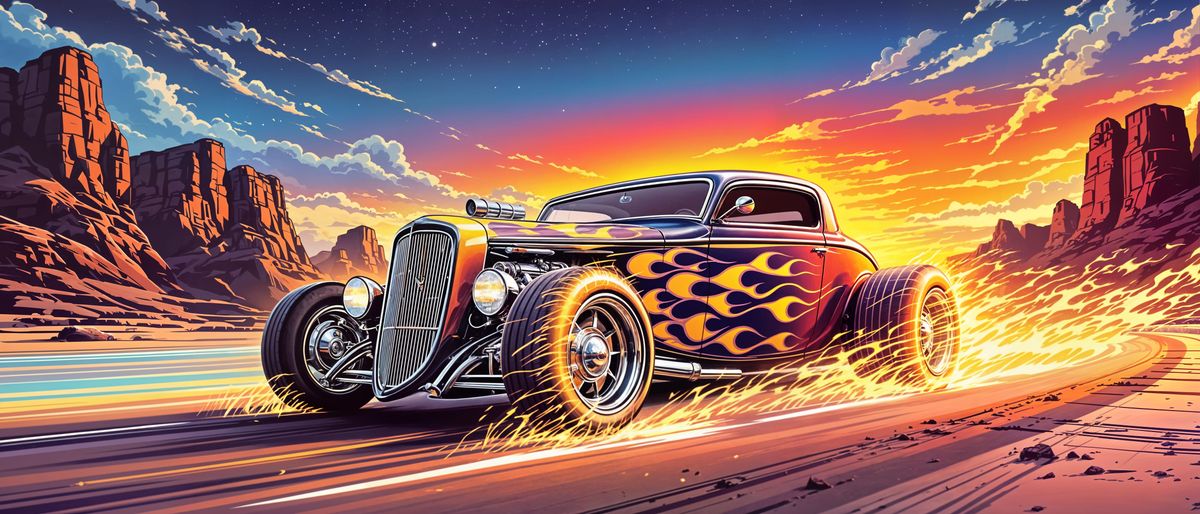 This image showcases an airbrushed rat rod design reminiscent of 1980s t-shirts. The artwork features vivid, smoothly blended colors and exaggerated chrome details in a retro-futuristic style.