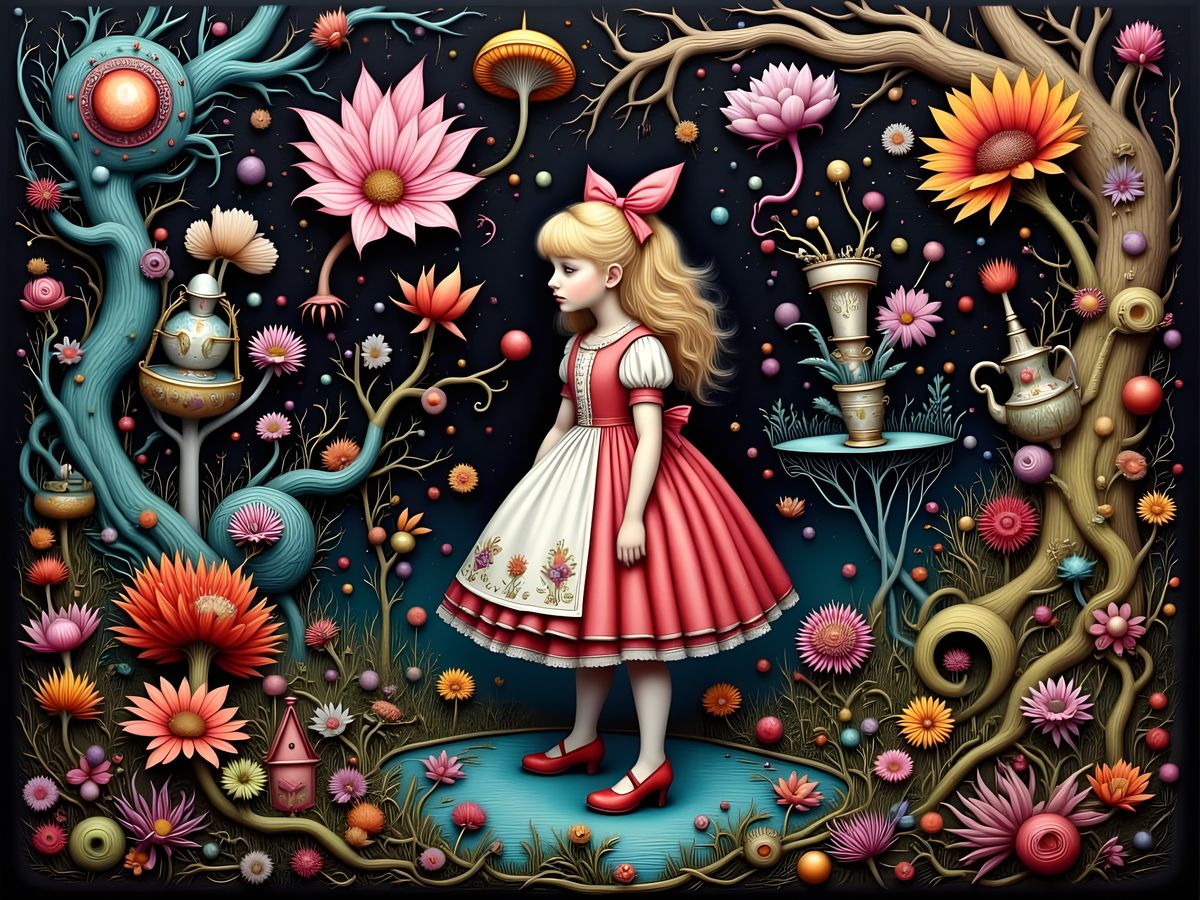 This image depicts a young girl experiencing a surreal wonderland, blending gothic and whimsical elements with a vibrant oil on canvas style. It features black, white, and red tones in a hyper-detailed, cinematic composition.