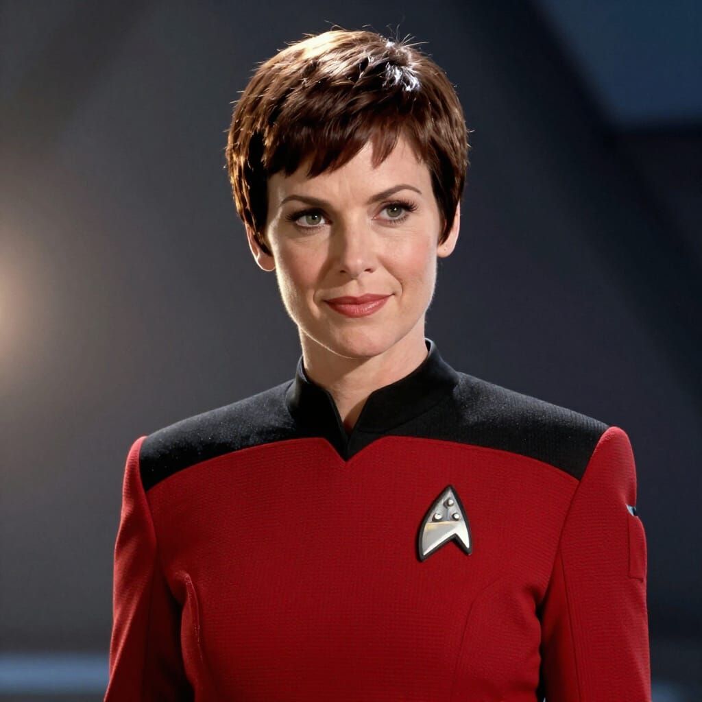 This image features a commanding, mid-30s human female captain with short brunette hair, dressed in a detailed red Starfleet uniform. Cinematic lighting highlights her confident expression.