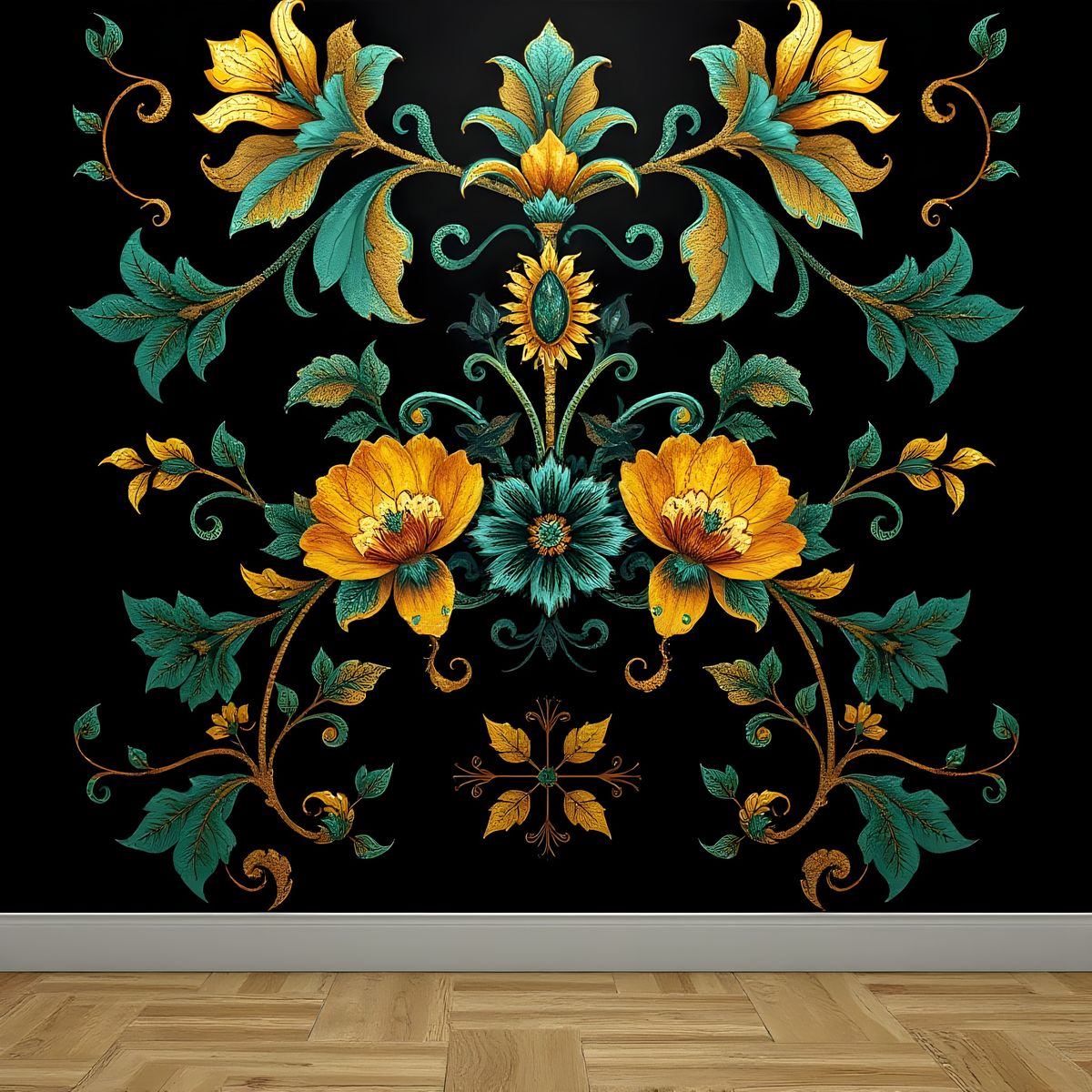 A stunning modern art mural featuring intricate floral designs in gold, dark blue, and green, set against a black and golden background with a shiny golden light texture, showcasing dynamic lighting and triadic colors