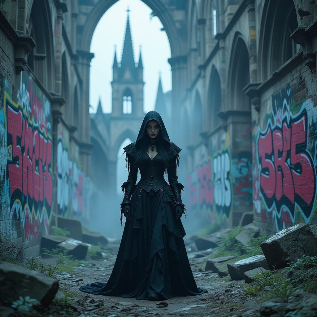 This image shows a goth in black clothing standing in cathedral ruins. Graffiti art covers the crumbling walls, with mist and decay creating a moody atmosphere, reminiscent of dark fantasy concept art.