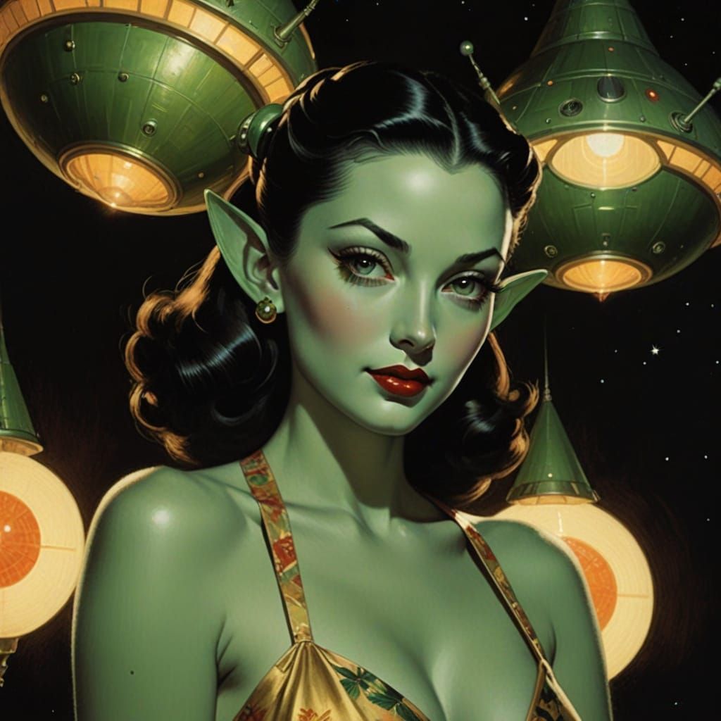 This image depicts a stunning Retro Science Fiction female alien in a futuristic spaceship with intricate details and vibrant colors, evoking the glamour of classic pin-up art.