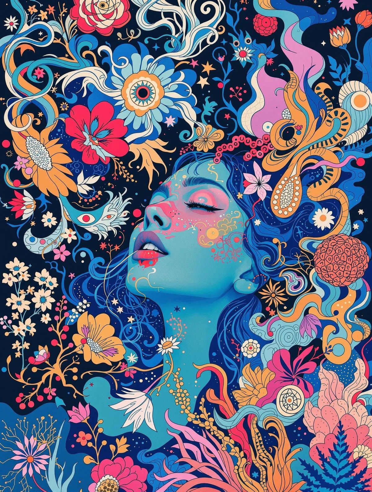This image is a surreal blend of fine art and graphic design, featuring a woman lost in thought amidst swirling shapes and vibrant cyan-toned botanicals, with bold typography and a striking 9:16 aspect ratio.