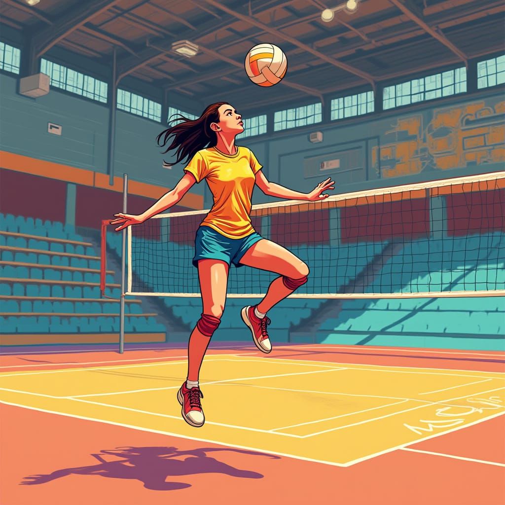 A vibrant image of a volleyball player spiking the ball on a colorful indoor court. The artwork features bold lines and dynamic colors in a modern, illustrative style.