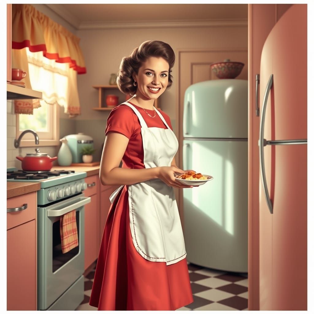 A young homemaker smiles warmly in a vibrant 1950s kitchen, surrounded by pastel appliances and a checkered floor, as morning light spills through ruffled curtains.