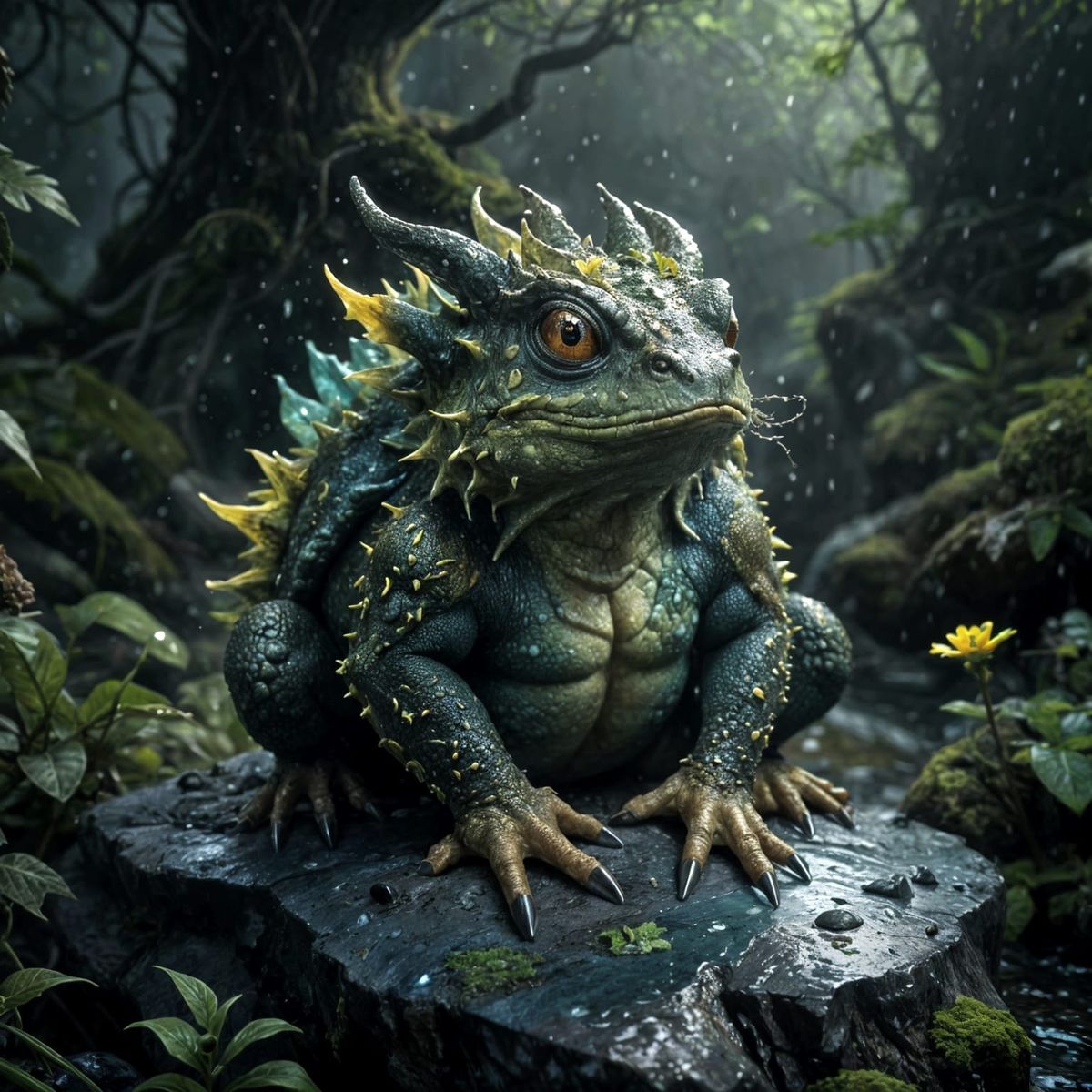 dragon toad with dragon type horns dark green and yellow skin with protruding warts , sitting on a rock in the forest will a rainfall with piercing sunlight, flower in the foreground and moss and vines