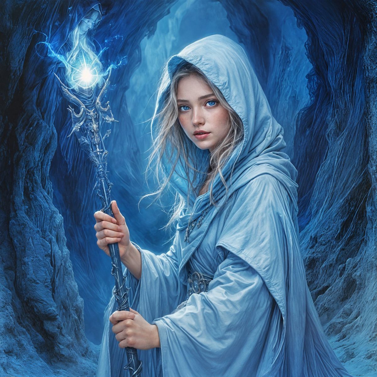 A detailed pastel illustration of a beautiful woman in a blue cloak exploring a mysterious blue cavern. She carries a glowing staff in this fairytale scene.