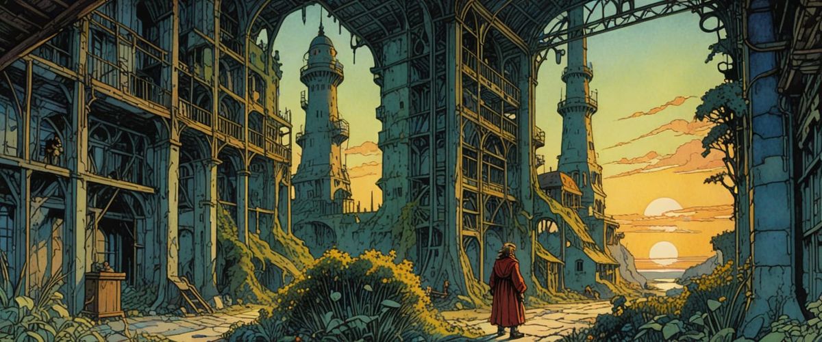 A watercolor painting of a person in an abandoned factory, bathed in warm sunlight filtering through lush tropical plants. Features vibrant indigo shadows and mossy greens.