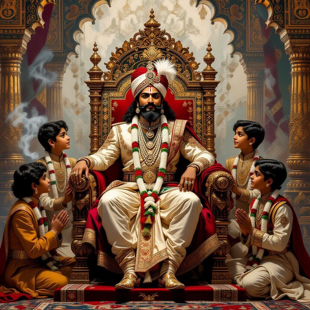 A vivid image of an Indian king on an elephant throne, attended by his sons. The scene is rich with tapestries, gold, and incense in a Mughal style with digital art elements.