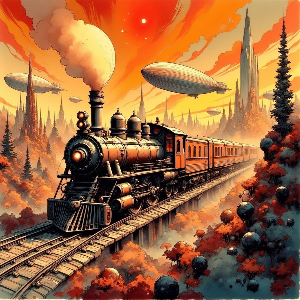 <lora:Alfa Caeli:1.0> Trashpunk art. A polka-dotted steam engine train speeds through a futuristic cityscape. Zeppelins float overhead. Style of Syd Mead. Sunset. Beautiful orange, yellow, and red skies. Realistic style, fall colors, detailed, intricate, best quality, a masterpiece, 8k resolution.