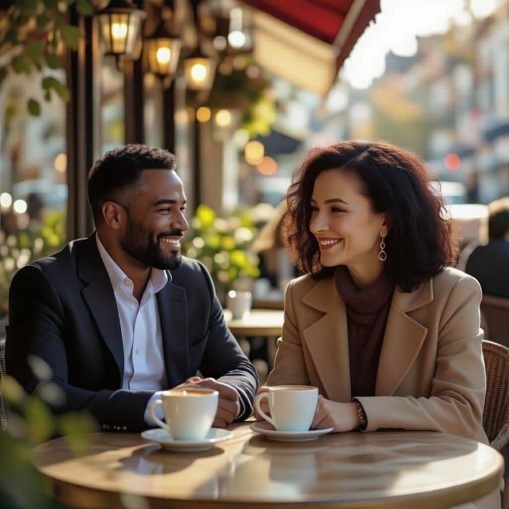 A warm scene of a Black man and a White woman in their forties and fifties, sharing a coffee break outside a charming cafe.