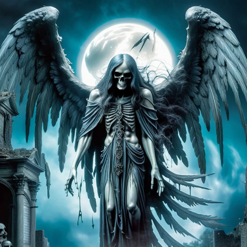 This haunting image depicts a fallen angel of death amidst crumbling gothic ruins, illuminated by the eerie glow of moonlight.