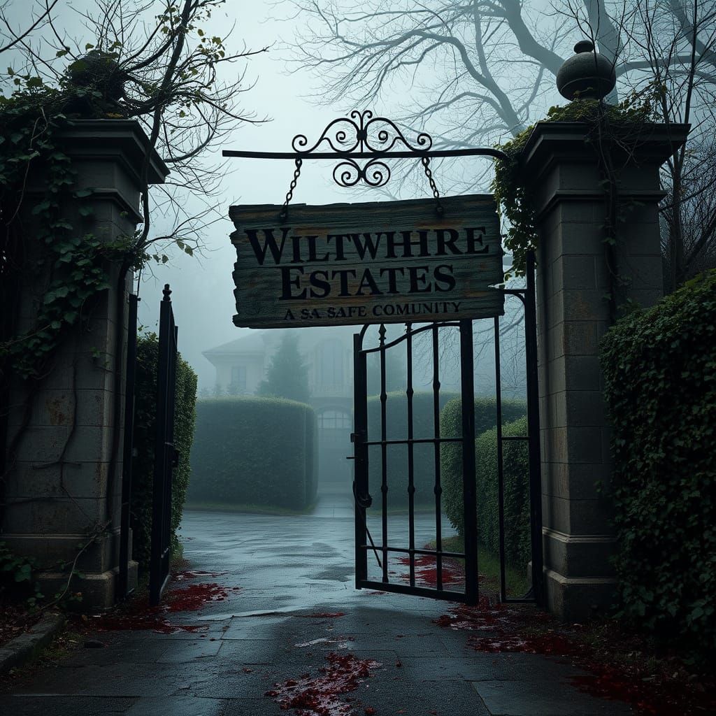 A spooky image of a dilapidated suburban entrance with a crooked sign. Overgrown foliage, twisted metal, and magical fog create an eerie, decaying scene.