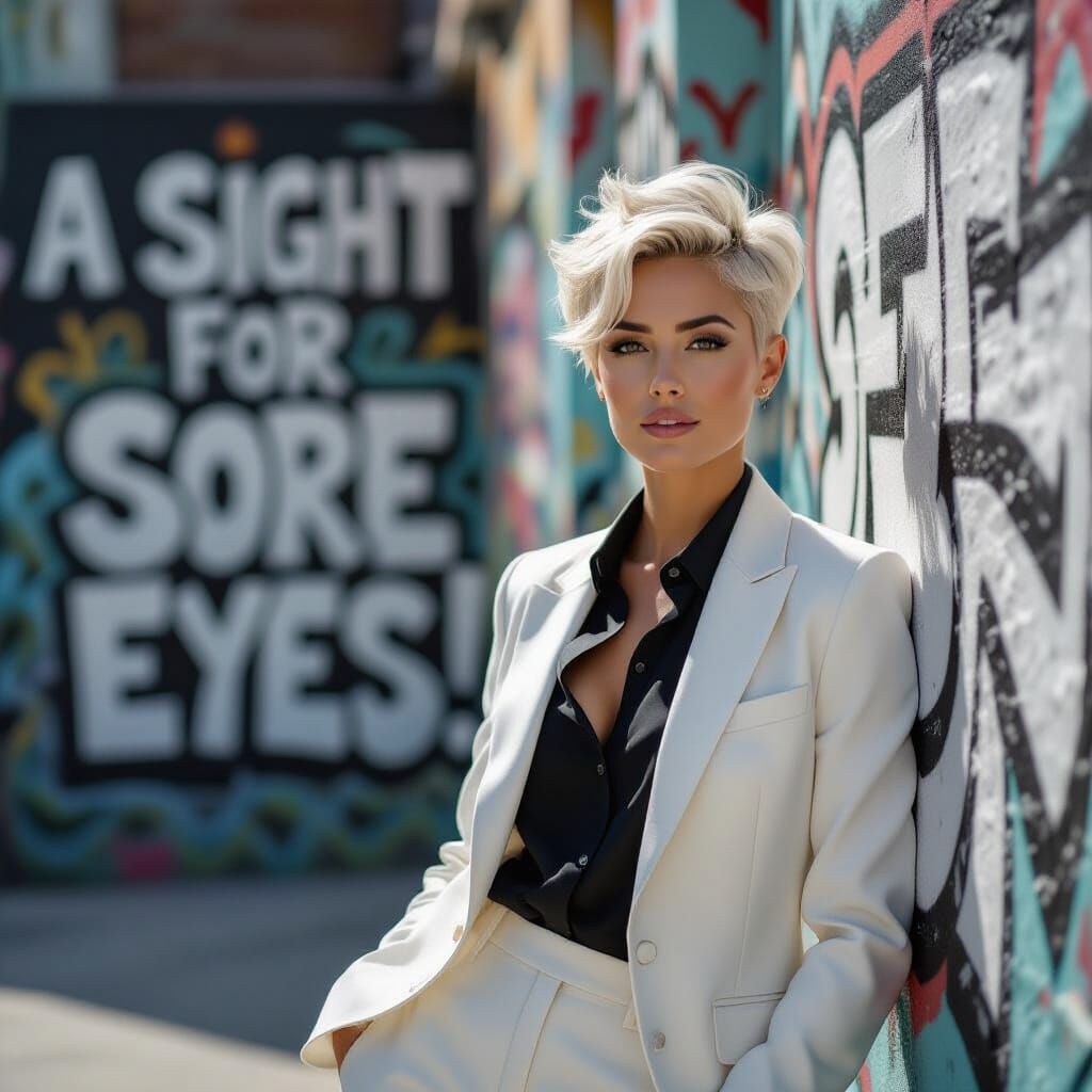 This image shows a fit woman with short white hair in a white suit and black shirt, casually leaning against a graffiti wall on a sunny day. The graffiti includes the phrase 'A sight for sore eyes!' This cinematic image features film grain and dramatic lighting.
