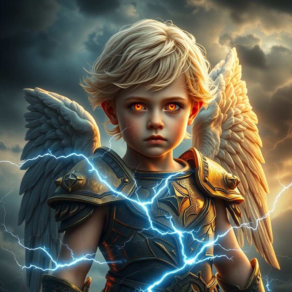 A young angel, once golden, now tarnished, stands strong against a turbulent sky, his fiery eyes aglow, surrounded by an otherworldly aura, ethereal mist, and crackling energy