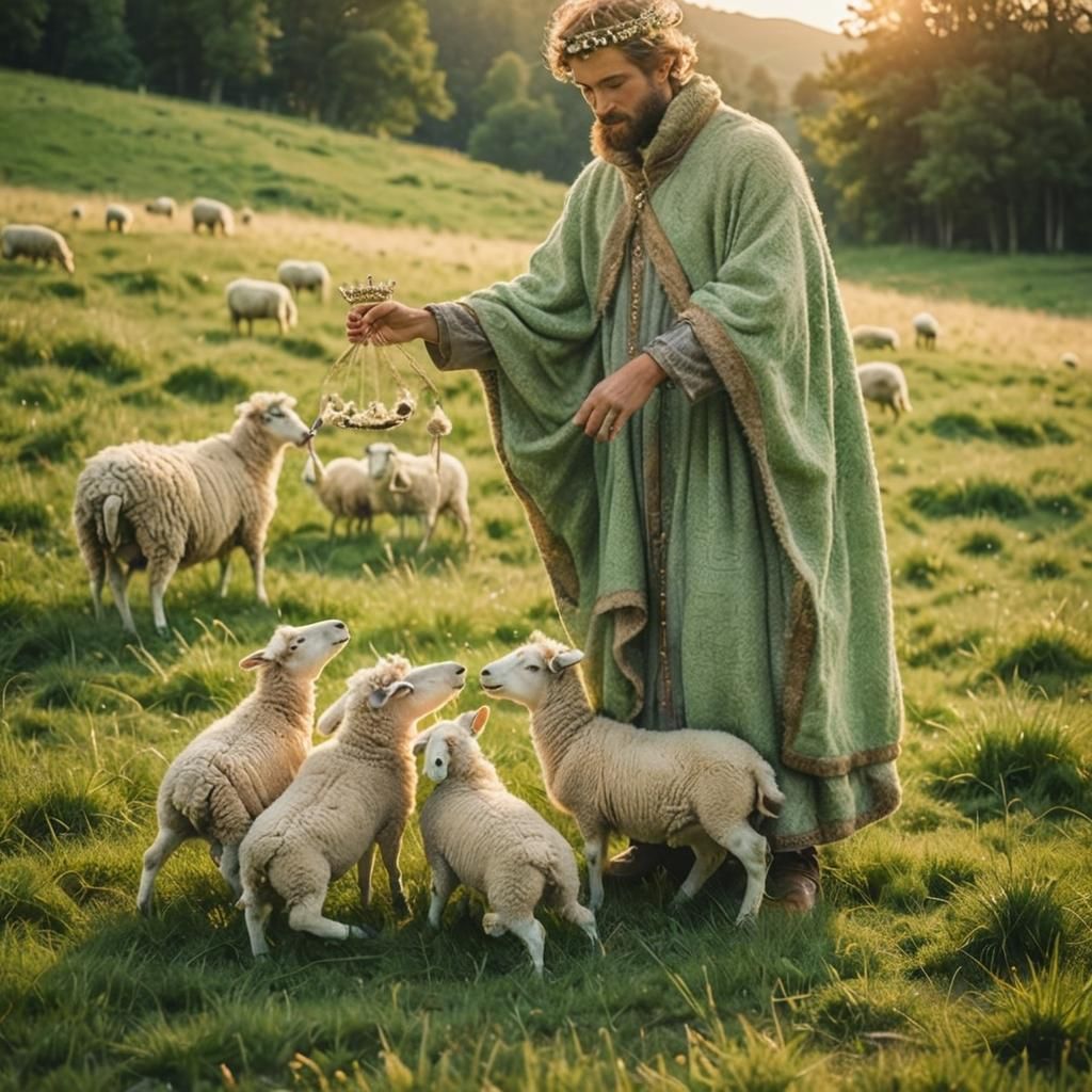 This image shows a man gifting a tiara to five sheep in a meadow. The soft focus photography uses pastel colors and warm light to create a feeling of serenity and wonder.