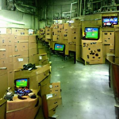 This image shows a vintage video game console in a dimly lit backroom. The console is surrounded by dusty boxes and forgotten technology, rendered in a photorealistic style.