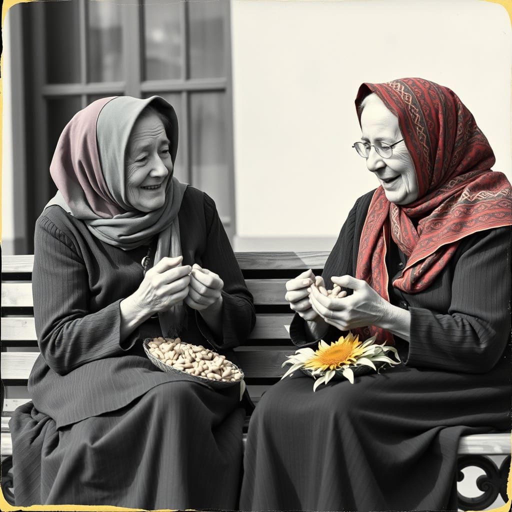 This image shows two elderly women with vibrant headscarves sharing sunflower seeds and jokes on a park bench. The photo is a black and white image reminiscent of the 1950s.