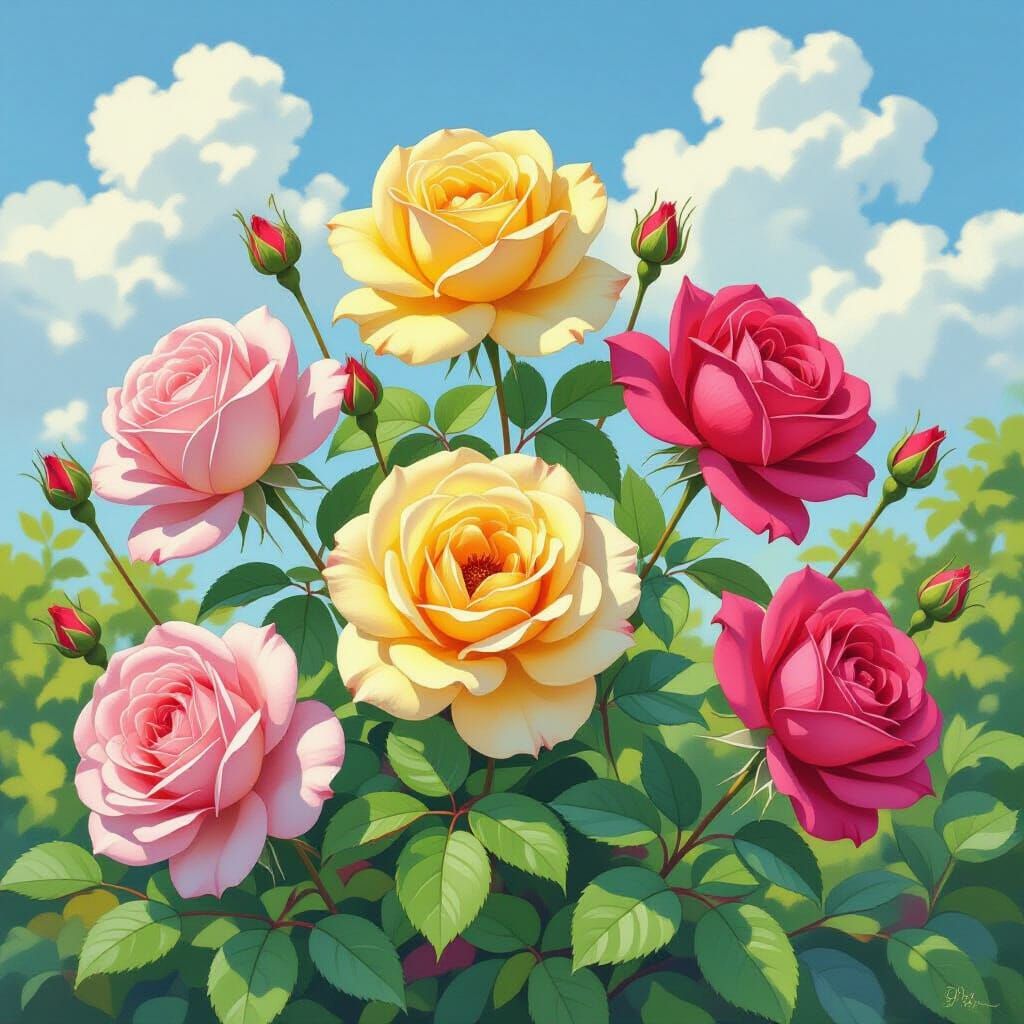 This image shows ten rose flowers blooming in a garden against a sunny sky. The watercolor painting style evokes a whimsical and colorful aesthetic, with varied hues of pink, yellow, and red.