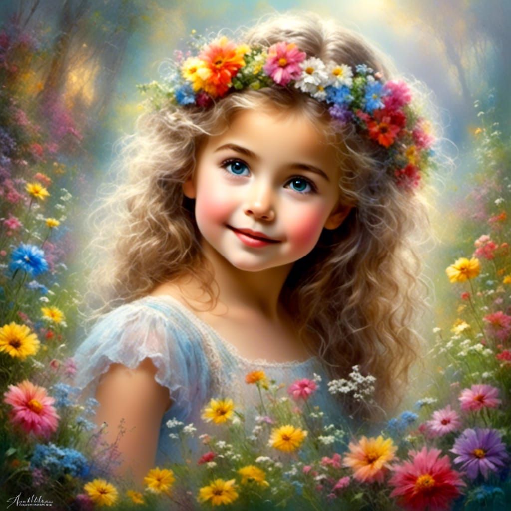 This image shows a beautiful three-year-old girl with a radiant face and wide eyes, surrounded by colorful flowers. The artwork captures a hyperdetailed, ethereal fantasy scene.