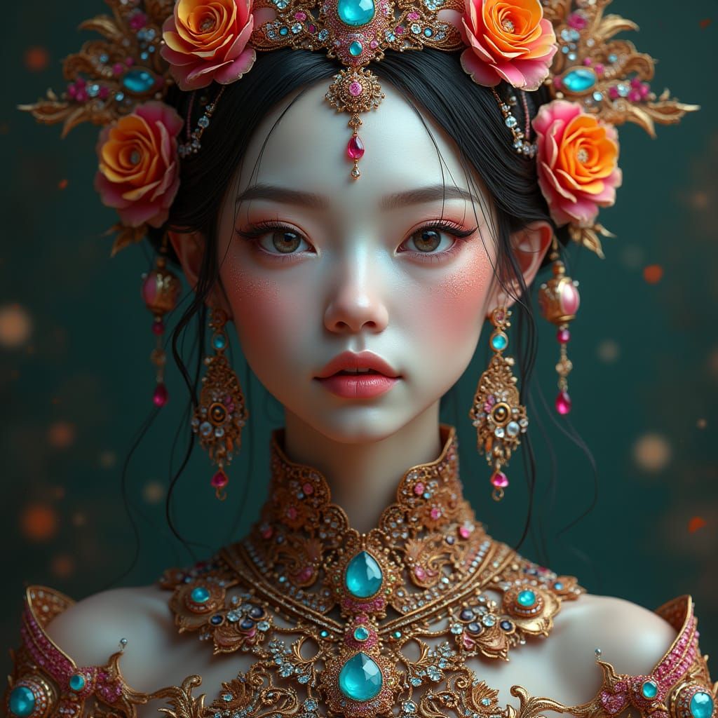 A hyperrealistic portrait of a strikingly beautiful woman, adorned in intricately detailed, vibrant clothing that extends from the neck upward like a masterpiece. Her futuristic jewelry glows with metallic hues and subtle light, blending tradition with innovation. Every thread, texture, and gem reflects exquisite craftsmanship, creating a powerful visual fusion of culture, fashion, and future-forward elegance.